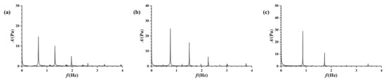 To validate the sloshing test setups, the first natural frequencies of sloshing at different liquid-carrying rates were measured and compared to those theoretical values obtained from Equation (1). To measure the resonant sloshing frequency, an initial perturbation was introduced to the liquid tank, allowing the liquid to undergo free decay under the influence of gravity. By employing fast Fourier analysis (FFT) on the time history curve of the sloshing pressure at a designated measurement point on the free liquid surface, frequency spectra were obtained, as illustrated in Figure 3. The peaks in the frequency spectrum demonstrate the resonant frequencies of the sloshing. A comparison of theoretical and experimental outcomes for the first-order sloshing resonant frequency, as detailed in Table 1, consistently affirms the resonance frequency’s uniformity across various liquid-carrying rates, establishing a dependable foundation for experimental case design. The test cases are divided into cases of equal-amplitude pitch and varied-amplitude pitch to discern the impact of different control parameters, as outlined in Table 2.