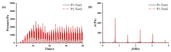 Comparison of the results of two repetitive tests at h = 30%H, A = 2°, f = 0.76 Hz condition: (a) Impact pressure for 40 s; (b) Amplitude spectrum for the entire sampling time.