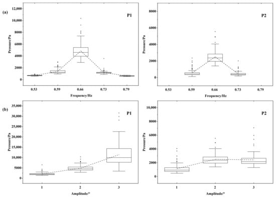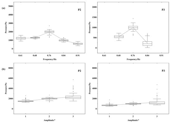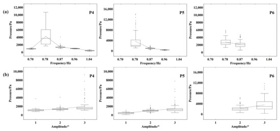 Figure 6 presents the statistics of the sloshing pressures at a 20% liquid-carrying rate. The analysis focuses on pressures at two monitoring points, namely, P1 and P2. P1 is situated at the still-free surface level, while P2 is located 10 cm above the still-free surface. The average value of each column is connected by a dotted line in the figure to show the trend of peak pressures. As can be seen from Figure 6a, when excitation frequencies are far from the resonant frequency (say f = 0.53 Hz (0.8 f1) and f = 0.79 Hz (1.2 f1)), the sloshing fails to reach the P2 measurement point. When the excitation frequency is close to the resonance frequency, the wave amplitude increases, and a continuous sloshing pressure is detected at the P2 measurement point. During the sloshing, the P1 measurement point experiences significantly larger impact pressures compared to the P2 measurement point, indicating the severity of the sloshing pressures at the free liquid surface. When the excitation frequency approaches the resonance frequency, the pressures at both P1 and P2 increase significantly. The box length increases consequently. Outliers appear in the peak pressures and are concentrated on the side of larger values. The increase in box length reflects a greater scatter of the peak pressure data. The distribution of the peak pressures is the most dispersive at the resonance frequency. This indicates that the sloshing in the liquid tank is most intense at the resonance frequency. From Figure 6b, it can be seen that the increase in the pitch motion amplitude enhances the sloshing pressures, and has a significant effect on the sloshing pressure at P1. This results in a maximum value of sloshing pressure at the free surface level at A = 3°, f = 0.66 Hz (1.0 f1) as expected.