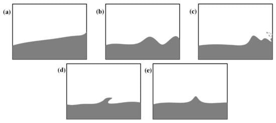 Five wave patterns [12]: (a) standing wave; (b) unbroken traveling wave; (c) traveling wave breaking near the bulkhead; (d) hydraulic jumps; (e) solitary wave.