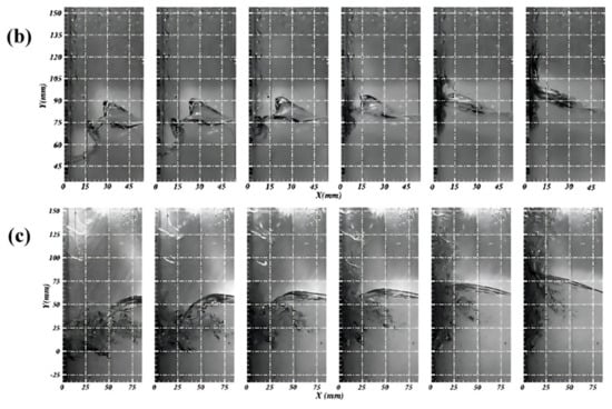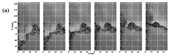 By changing the excitation amplitude from 1° to 3° at the resonance frequency, the sloshing waveforms remain consistent, with variations only in the degree of nonlinear intensity. The generation of the hydraulic jumps under resonance conditions causes the liquid to hit the wall, and may involve flip and gas cavity phenomena [1]. By analyzing the flip mode of the liquid tank sloshing at resonance frequency, it is seen from Figure 14 that the flip mode (a) of breaking wave impact without air entrapment occurs for the two conditions of A = 1°, f = 0.66 Hz and A = 2°, f = 0.66 Hz. Meanwhile, for the condition of A = 3°, f = 0.66 Hz, the flip mode of (b) breaking wave impact with air entrapment is observed.