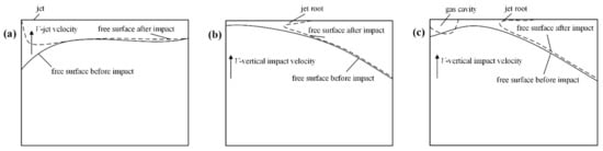 Three topping phenomena [25]: (a) high-curvature free-surface impact with a high-velocity jet; (b) flat impact; (c) impact with oscillating gas cavity.