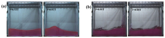 In Figure 15, the liquid movement in the tank at a 30% liquid-carrying rate is examined. At the excitation frequency of 0.61 Hz, the free liquid surface presents standing wave characteristics. At f = 0.68 Hz, the free liquid surface transforms into an unbroken traveling wave.