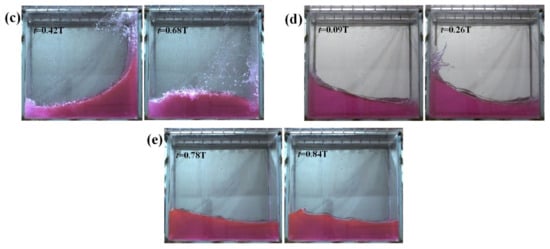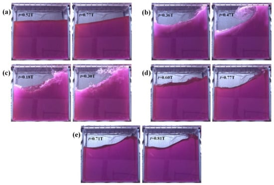Flows at resonant conditions at shallow, intermediate, and high liquid-carrying rates are significantly different. At shallow liquid-carrying rates, the hydraulic jumps may occur in the liquid tank. At intermediate and critical liquid-carrying rates, breaking waves are more likely to occur in the liquid tank [23], while at high liquid-carrying rates, the sloshing is feathered with liquid roofing. In this section, waveform characterization is performed based on the experimental findings of Olsen and Johnsen [12] (five wave patterns occurring as the sloshing changes with the excitation frequency, see Figure 10), Lugni et al. [24] (three flip modes of the liquid hitting the wall, see Figure 11), and Faltinsen [25] (three roof-hitting flows, see Figure 12). For this wave pattern analysis, a stable sloshing period is chosen with the flow motion starting from the equilibrium position (0T) of the liquid tank moving clockwise downward, and returning to the equilibrium position (1T) after one cycle.