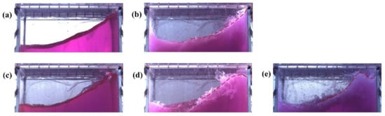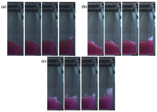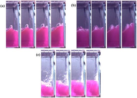 The flip mode of the liquid is incited by the relative motion of the wave peaks and troughs, causing accelerated liquid flow. This acceleration forces the troughs to rise rapidly at the wall, fostering a swift influx of liquid that subsequently leads to a vertical jet formation. As depicted in Figure 16, the two conditions A = 1°, f = 0.76 Hz and A = 2°, f = 0.76 Hz show the flip mode (a) of the breaking wave impact without air entrapment. In contrast, the A = 3°, f = 0.76 Hz condition demonstrates the flip mode (c) of the breaking wave impact with air-water mixing. These latter two flip modes occur less frequently during sloshing, as the breaking wave shock with air entrainment or air–water mixing requires a more violent liquid wavefront breakup and a higher degree of instability to be excited.