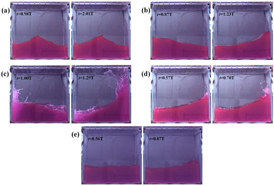 Liquid movement in the liquid tank at 20% liquid-carrying rate from five cases of different excitation parameters: (a) A = 2°, f = 0.53 Hz; (b) A = 2°, f = 0.59 Hz; (c) A = 2°, f = 0.66 Hz; (d) A = 2°, f = 0.73 Hz; (e) A = 2°, f = 0.79 Hz (t is the motion time, T is the excitation period).