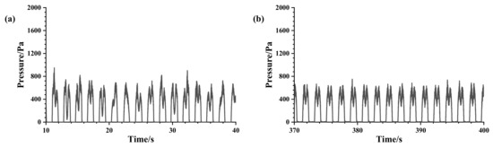 Time-course curves of sloshing pressures at h = 20%H, A = 2°, f = 0.53 Hz condition: (a) the initial phase (10–40 s); (b) the final phase (370–400 s).