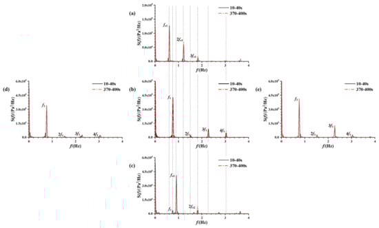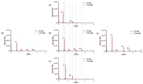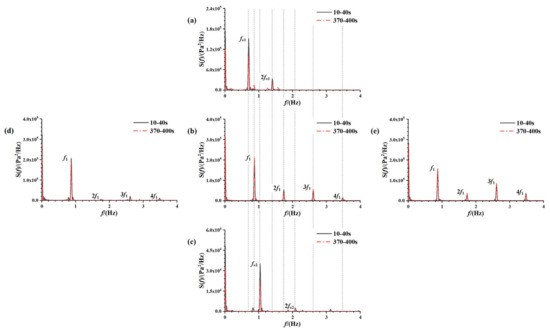 Power spectra of the sloshing pressure history curve for the measurement point at a 30% liquid-carrying rate free liquid surface from five cases of different excitation parameters: (a) A = 2°, f = 0.61 Hz; (b) A = 2°, f = 0.76 Hz; (c) A = 2°, f = 0.91 Hz; (d) A = 1°, f = 0.76 Hz; (e) A = 3°, f = 0.76 Hz.