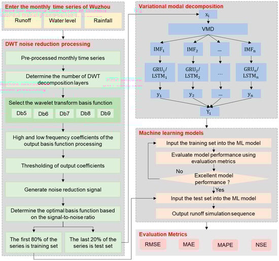 In this study, the DWT–VMD–GRU framework has been devised and is being contrasted against other models. We hold that this framework is capable of capturing the nonlinear relationships between rainfall and runoff, thereby enhancing the precision of monthly runoff forecasts. We believe it is particularly well suited for runoff prediction in regions with limited observational hydrological data. Consequently, this study first employs DWT to denoise the runoff sequence, mitigating the impact of sequence noise on model accuracy. Subsequently, by decomposing the sequence with the VMD technique, sequence features are accentuated, facilitating sequence recognition. Finally, four different input combinations are utilized as inputs for two neural network models (GRU and LSTM), with performance comparison conducted for each model.