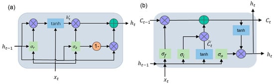 Architectures of (a) gated recurrent unit and (b) long short-term memory. σr and σz stand for the logical sigmoid function of the reset gate and the update gate. σf, σi, and σo stand for the logical sigmoid function of the forget, input, and output gates at t-th time step.
