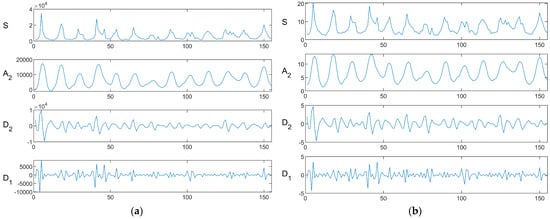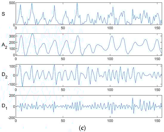 The initial sequence (i.e., noise signal) undergoes decomposition into the approximate and detail signals (Figure 3). Continuous decomposition effectively unveils concealed noisy signals present within the original sequence. While the DWT theoretically accommodates an infinite number of layers, this approach escalates computational complexity significantly. However, the number of DWT layers minimally impacts model prediction [].
