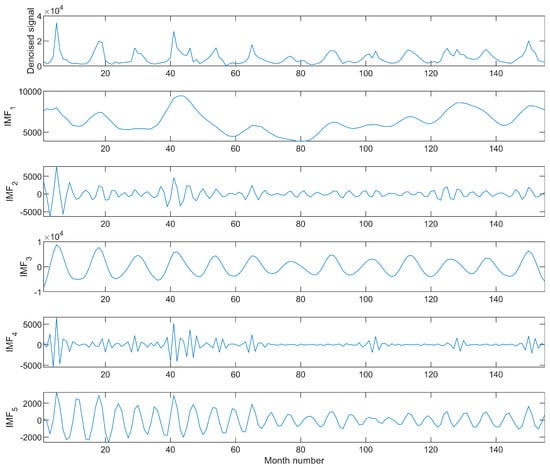 Table 1 presents the outcomes of VMD applied to sequences reconstructed by DWT noise reduction. Notably, among all adjacent modal components, the central frequencies of IMF2 and IMF3 are the closest. As K increases from 6 to 8, the central frequencies of these two modal components converge. This trend suggests that starting from K = 6, the occurrence of modal overlap may become apparent. Conversely, if K is too small, insufficient decomposition may result []. Consequently, K = 5 is determined as the optimal count of decomposition layers for VMD.