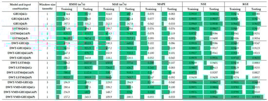 Error and optimal sliding window size of GRU, LSTM, DWT–GRU, DWT–LSTM, and DWT–VMD–GRU models. Discrete wavelet transform, DWT; gate recurrent unit, GRU; Kling–Gupta Efficiency, KGE; long short-term memory, LSTM; mean absolute error, MAE; mean absolute percentage error, MAPE; Nash–Sutcliffe Efficiency, NSE; root mean square error, RMSE; variational modal decomposition, VMD. Note: runoff as inputs, Q; runoff and water level as inputs, Q&L; runoff, water level, and rainfall as inputs, Q&L&P; runoff and rainfall as inputs, Q&P.