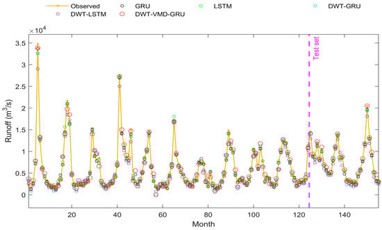 Observed monthly runoff series and predicted series by neural network models. The input variables for all models encompass monthly runoff and rainfall series. Discrete wavelet transform, DWT; gate recurrent unit, GRU; long short-term memory, LSTM; variational modal decomposition, VMD.