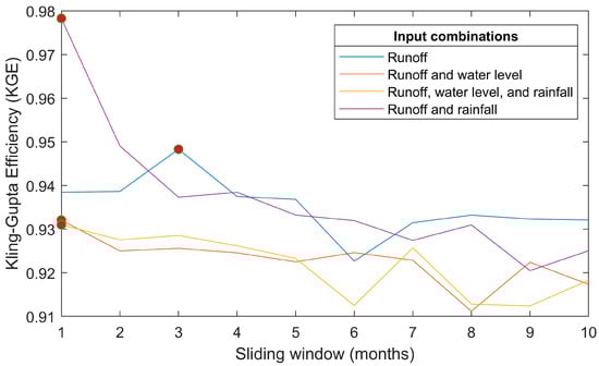 Kling–Gupta Efficiency values of DWT–VMD–GRU in predicting monthly runoff with different input combinations and sliding windows. Discrete wavelet transform, DWT; dots illustrate the optimal number of sliding Windows for each input combination; gate recurrent unit, GRU; variational modal decomposition, VMD.