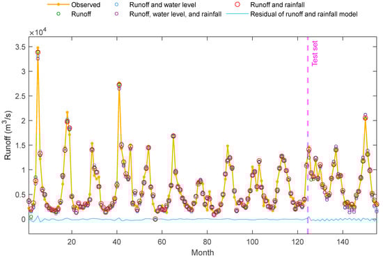 Figure 11 depicts the runoff time series simulated by the DWT–VMD–GRU model utilizing various input variables. Our analysis yields the following conclusions: (1) The examination of the residual plot indicates that the DWT–VMD–GRU model, utilizing runoff and rainfall as inputs, exhibits superior performance compared to three other input combinations, a finding consistent with Tiwari et al.’s (2022) conclusion []. (2) Regarding the performance in predicting the maximum annual runoff, the DWT–VMD–GRU model demonstrates that the combination of runoff and rainfall as inputs yields the best results, followed by runoff and water level, and finally, runoff alone. In summary, the model utilizing runoff and rainfall as inputs outperforms the model using only runoff as input in simulating the overall sequence.