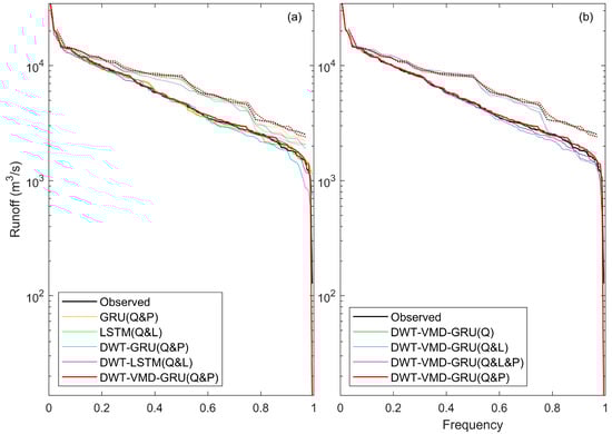 Flow duration curves: (a) optimal models: GRU, LSTM, DWT–GRU, DWT–LSTM, and DWT–VMD–GRU; (b) DWT–VMD–GRU models with various input combinations. Solid lines indicate flow duration curves across both training and testing phases; dashed lines illustrate flow duration curves specifically for the testing phase. Discrete wavelet transform, DWT; gate recurrent unit, GRU; long short-term memory, LSTM; variational modal decomposition, VMD. Q, L, and P denote runoff, water level, and precipitation time series, respectively.