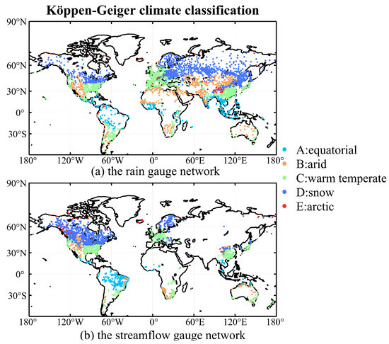 The daily rain gauge observations used in this paper were collected from the Global Summary of the Day database (https://data.noaa.gov, accessed on 1 April 2024) and the China Meteorological Administration website (http://data.cma.cn/, accessed on 1 April 2024). Two criteria were used in selecting suitable rain gauges: (1) gauges with available data from 1982 to 2015; (2) missing and invalid observations <1% of the period length. A total of 2404 gauges were selected and their distributions are shown in Figure 1a. In accordance with the Köppen–Geiger climate classification system, 2404 measurement gauges are categorized into five primary climate categories: Equatorial (A), Arid (B), Warm Temperate (C), Snow (D), and Arctic (E) [55].