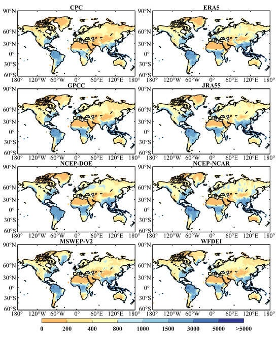 The spatial distributions of global long-term average annual precipitation of eight precipitation datasets are similar (Figure 3). The precipitation near the equator is the highest. The precipitation is significant on the east coast of the mainland due to the summer monsoons coming from the ocean. In addition, the west coast of the mainland around the Tropic of Capricorn and Cancer experiences a reduced amount of precipitation due to the subtropical high-pressure belt [81,82]. For example, West Asia and North Africa on the west coast of the mainland are dry and rainless in the prevailing northeast trade wind and the subsidence of air. However, the climatic conditions along the east coast of the mainland, exemplified by regions in East Asia, are humid and rainy due to the prevailing southerly winds from the ocean in summer. In addition, mid-latitudes and inland areas receive less precipitation as they are far from the sea, such as the northwestern region of China.