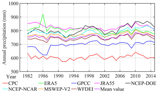 Considering the spatial and temporal coverages, eight gridded precipitation datasets with a temporal span greater than 30 years (from 1982 to 2015) covering global land surface were evaluated in this study (Table 1). These include two gauge-based precipitation datasets (CPC and GPCC), five reanalysis datasets (ERA5, NCEP–NCAR, NCEP–DOE, JRA55 an WFDEI), and one satellite-gauge-reanalysis dataset (MSWEP V2). The CPC is operated by the National Oceanic and Atmospheric Administration. It integrates data from over 30,000 stations and covers the period from 1979 to the present [9]. The GPCC is available from 1981 to 2016. The data sources used in developing this dataset house more than 50,000 weather stations around the world [6,14]. The ERA5 is a reanalysis product developed by ECMWF using the 4D-Var data assimilation techniques and is available from 1950 to present [50]. The NCEP–NCAR [51] is developed using a fixed assimilation system and is available for the period from 1948 to the present. The NCEP–DOE is an improved version of the NCEP–NCAR, which fixed errors and updated parametrization of physical processes [52]. The MSWEP V2 [20] is based on the weighted averaging of several satellites, gauges, and reanalysis products and is available from 1979 to the present. The JRA55 is produced by the Japan Meteorological Agency (JMA) covering the period 1958 until the present [19]. In addition, the WFDEI is derived from the reanalysis of the European Centre for Medium-Range Weather Forecasts and is covers the period from 1979 to 2016 [7].