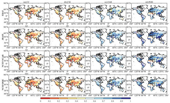 The CC (the first column—(a,e,i,m)), CSI (the second column—(b,f,j,n)), FAR (the third column—(c,g,k,o)) and POD (the last column—(d,h,l,p)) between the UPDs and observed precipitation data (during 1982–2015).