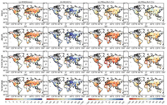 The RMSE (the first column—(a,e,i,m)) and Bias (the second column—(b,f,j,n)), PBias-Rx1 (the third column—(c,g,k,o)) and PBias-Rx5 (the last column—(d,h,l,p)) between the UPDs and observed precipitation data (during 1982–2015).