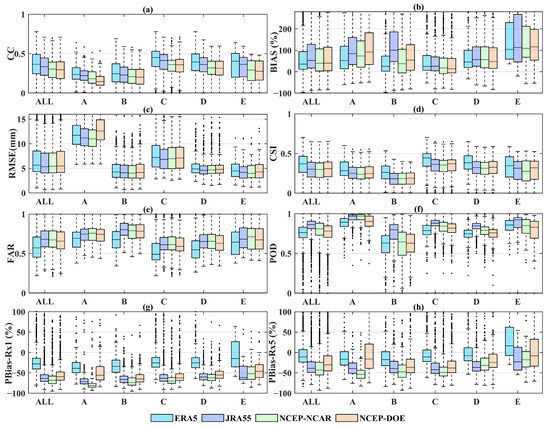 Boxplots of CC (a), BIAS (b), RMSE (c), CSI (d), FAR (e), POD (f), PBias-Rx1 (g) and PBias-Rx5 (h) between gauge-observed precipitation and four UPDs in different climate region. A, B, C, D and E represent the equatorial (A), arid (B), warm temperate (C), snow (D), and Arctic (E) region, respectively.