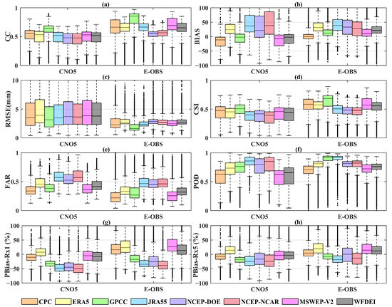 Boxplots of CC (a), BIAS (b), RMSE (c), CSI (d), FAR (e), POD (f), PBias-Rx1 (g) and PBias-Rx5 (h) between two high-resolution gridded gauge-interpolated datasets (CN05 and EOBS) and eight precipitation datasets.