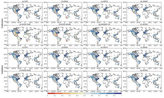 Spatial distribution of KGE values obtained from GR4J driven by eight precipitation datasets in calibration (a–h) and validation periods (i–p).