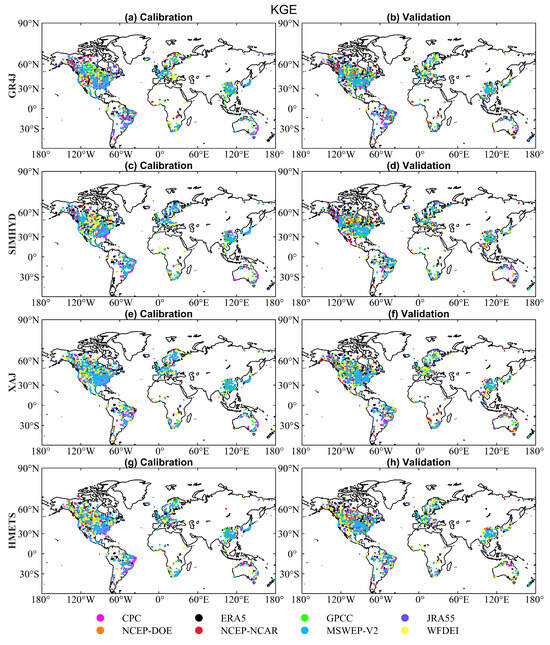 Figure 12 presents the best performing precipitation datasets (i.e., with the highest calibration and validation KGE) for each catchment (see Figure A4 for Spatial patterns of NSE). The ranking of the best performed precipitation dataset in GR4J (i.e., the proportion of catchments the dataset exhibited optimal performance) is MSWEP V2 (33.1%), CPC (16.3%), GPCC (15.4%), JRA55 (12.1%), ERA5 (9.3%), WFDEI (7.8%), NCEP–NCAR (5.2%) and NCEP–DOE (0.8%) in the calibration period, and MSWEP V2 (27.2%), CPC (13.1%), GPCC (12.1%), JRA55 (9.4%), ERA5 (22.6%), WFDEI (6.9%), NCEP–NCAR (5.2%) and NCEP–DOE (3.5%) in the validation period. Comparable outcomes are achieved in other models. The MSWEP V2, in combination with various satellites, gauges, and reanalysis products, outperforms other precipitation datasets.