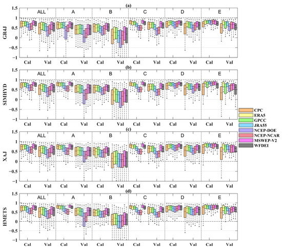 Boxplots of KGE values of different precipitation datasets for both calibration period (Cal) and validation period (Val) in different climate regions ((a) GR4J, (b) SIMHYD, (c) XAJ, (d) HMETS). A, B, C, D and E represent the equatorial (A), arid (B), warm temperate (C), snow (D), and Arctic (E) region, respectively.