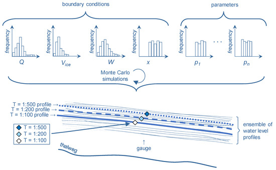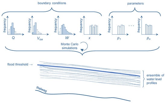 Another method to forecast ice-jam flooding, which has gained much traction in the literature in recent years, is the stochastic modelling approach. Here, a deterministic model is placed within a Monte-Carlo framework in which many hundreds or thousands of simulations can be run. Each simulation has its own unique boundary condition and parameter values selected randomly from frequency distributions of those values. The simulations yield an ensemble of floodwater level profiles, the percentiles of which place the levels within a probabilistic context. The deterministic model within the framework maintains the numerous descriptions of physical processes related to the formation of ice jams and backwater staging. The Monte-Carlo analysis allows the likelihood of various possible outcomes and exceedance thresholds to be calculated.