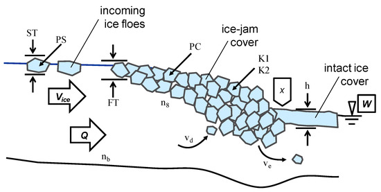Ice jam with boundary conditions (Q, Vice, W, and x) and parameters (FT, h, K1, K2, n8, nb, PC, PS, ST, vd, and ve); see text for definitions of each.