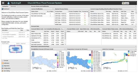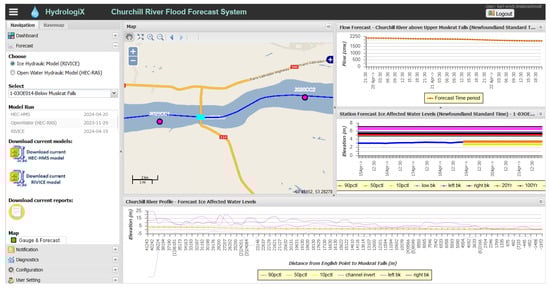 Dashboard of the Churchill River Flood Forecast System for operational ice-jam flood forecasting on 17 April 2024.
