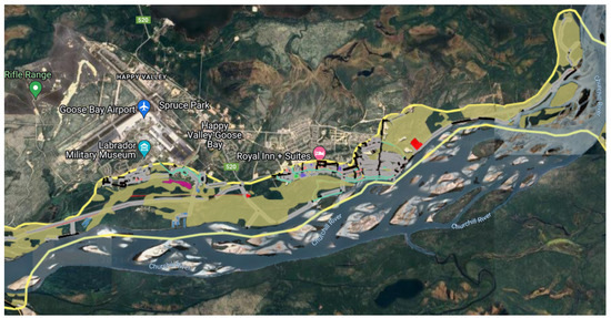 An operational ice-jam flood forecasting system has been implemented for the Churchill River in Labrador. Referring to Figure 5, the Churchill River is a large and complex river system that drains an area of approximately 94,000 km2 and flows into Lake Melville, a brackish water body that connects to the Atlantic Ocean [31]. The basin’s landcover consists of approximately 52% forest, 26% water and wetlands, and 21% mixed barren areas with rock outcrops, while the remaining 1% is residential, commercial, or deforested areas [28]. Close to the river’s mouth, the coldest month of the year is January with an average air temperature of −17.0 °C, and the warmest month is July with average air temperatures of 15.8 °C (30-year averages for 1991–2020; data for Goose Bay from https://climate.weather.gc.ca/ (accessed on 23 May 2024)). The average yearly precipitation is 937.8 mm with 43% falling as snow from November to May. The river is regulated via two major hydroelectric facilities: the Churchill Falls Generating Station and the Muskrat Falls Generating Station, which have a combined capacity of 6300 MW. The outlets of the two facilities delineate the basin into the upper, middle, and lower subbasins. The Churchill River is also prone to ice-jam floods with a high flood risk along its lower reach, where the community of Mud Lake is located (see Figure 6). In May 2017, a large ice-jam flood occurred at this location, requiring the evacuation of the community and causing significant damage to infrastructure and property [31].