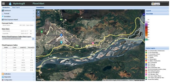 Another module added to the CRFFS is the flood exposure hazard module [35], shown in Figure 12. Flood exposure hazard refers to the potential damage or harm that could be caused by a flood event to people, infrastructure, and the environment. This can include factors such as property damage, loss of life, disruption of transportation networks, and contamination of water sources. To determine the flood exposure hazard, information on the inundation extent, depth, and probability component is used in conjunction with data on the value and location of community assets such as property developments, infrastructure, and natural resources. This information can be analysed using statistical models or other methods to estimate the potential impact of a flood event on these assets. This component has become an important part of flood risk assessment, as it helps communities understand the potential consequences of different flood scenarios and make informed decisions about how to mitigate and prepare for future events.
