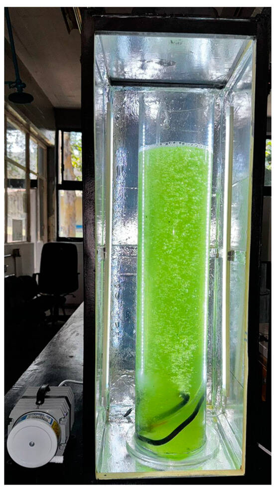 Both of the microalgal species were seeded and propagated in laboratory-scale microphotobioreactors with a total volume of 1 L and a useful volume of 500 mL. For both strains, a constant temperature of 25 °C was maintained. A pump was used to apply aeration at a flow rate of 1500 cc·min−1 and a pressure of 3.5 psi. The use of oxygen in aeration provides CO2 from the air as a carbon source and maintains the microphotobioreactors under agitation. For illumination, 20 W cold light LED lamps were used with an intensity of 35 μmoL·m−2·s−1 and light/shade photoperiods of 12 h each.
