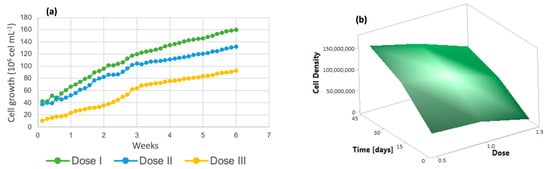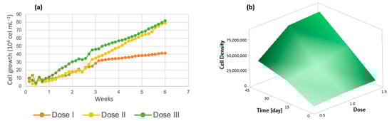 For the analysis of algal growth by quantifying the cell density of the cultures, dose 1 presented a lower number of cells, as shown in Figure 2a, while at dose 3, there was greater cell growth. Solutions of trace metals or trace elements contribute to increasing the yields of metabolic biological processes carried out by photosynthetic organisms [], increasing cell growth and crop propagation. In addition, it is important to emphasize that the life cycle of the algal species Chlorella lasts approximately 8 days [] and the reproduction time is 6 days, with an average growth rate of 4.75 million cells/mL []. The response surface graph (Figure 2b) shows how the addition of micronutrients caused changes in these variables, which indicates that the cell growth rate reached 75 million algal cells when dose 3 (denoted as 1.5) was applied. On the other hand, dose 2 had a 10% lower performance, and dose 1 reached only 40 million cells; these three doses were evaluated over the same time period of 7 weeks.