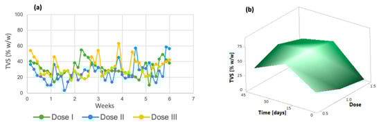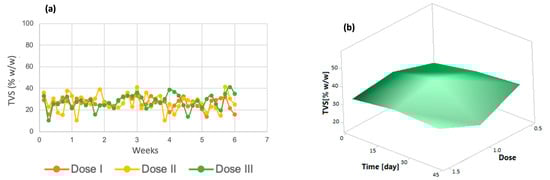 Similarly, volatile solids tended to decrease in the last days of the process (Figure 3a). The same trend was observed in the response surface graph (Figure 3b); only dose 3 increased in the last days of the process. Volatile total solids correspond to a fraction of the organic matter contained in a sample []; therefore, the decrease in these indicates that the removal of organic matter derived from the improvement in microalgal metabolism due to the addition of micronutrients is taking place.