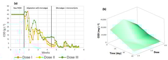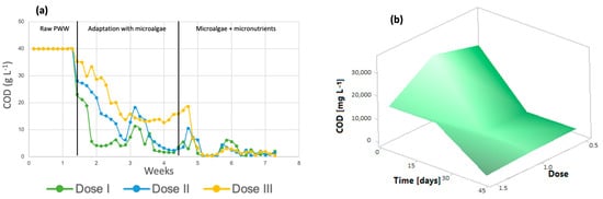 Figure 4a shows that throughout the 7 weeks of the process, the organic load in the microphotobioreactors decreased, reaching very small values after the addition of the micronutrients. According to the results obtained, the COD removal efficiency of the system can be calculated to be at least 96% for dose 3, 99.14% for dose 2, and 98% for dose 1. The initial COD was 39.95 g/L. The graph shows the three steps of the process: photobioreactors containing only wastewater, the stage in which microalgae are added for wastewater treatment, and finally, the addition of micronutrients to the algal cultures, where the greatest removal of organic matter is achieved. It is important to mention that microalgae do not carry out the COD removal process in waste, but the aerobic bacteria present in the effluent generate CO2, which is subsequently used for photosynthesis by the microalgae []. The response surface shown in Figure 4b shows a decrease in this parameter throughout the treatment at all three doses, which indicates that any dose is suitable for improving the COD removal efficiency.