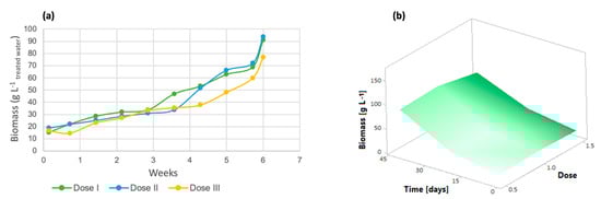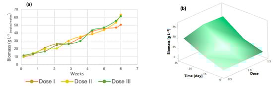In wastewater treatment with microorganisms such as microscopic algae, it is important to evaluate biomass generation, which is influenced by the cultivation of microalgae in poultry wastewater []. As shown in Figure 5a, the three doses of micronutrients contributed equally to algal biomass generation, as no significant differences were observed between the doses (p-value > 0.005). Dose 1 had the lowest amount of biomass, with a total of 50.73 g/L, while dose 2 had 61.53 g/L and dose III had 63.52 g/L, as confirmed by the response surface graph in Figure 5b since it was observed that algal biomass was generated during the course of the experiment and that dose 2 had a better effect on this variable than dose 1, which had a yield almost 20% lower.