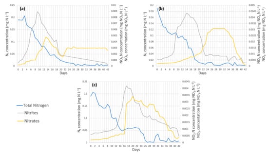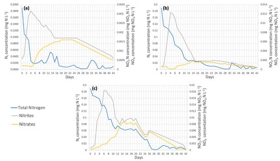 In terms of nitrogen removal (Figure 11), 98.08%, 99.33%, and 96.11% of the total nitrogen removal efficiency occurred in dose 1, dose 2, and dose 3, respectively, showing that the dose with the highest removal efficiency was dose 1. Samori et al. [] established that the nitrogen removed is incorporated into the microalgal biomass in the form of proteins, which explains why Spirulina maxima is one of the species richest in protein content []. Nitrite oxidation to nitrate occurred on week 2 day 16 for dose 1 (Figure 11a), week 2 day 15 for dose 2 (Figure 11b), and week 2 day 13 for dose 3 (Figure 11c).