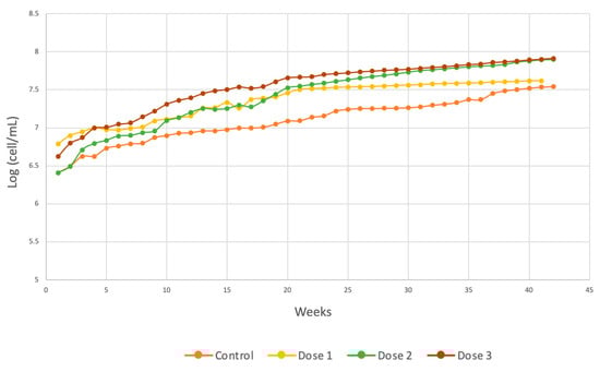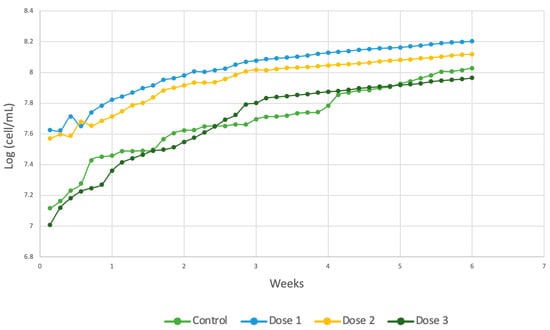 The first parameter evaluated in the Chlorella spp. cultures was pH. A constant value of 6.1 was maintained until the addition of micronutrients in the third week, where there was a slight increase to 6.4 in this parameter for the three doses, which subsequently remained stable until the end of the process. Chlorella microalgae grow adequately in media with a pH between 7 and 8 [], so the addition of micronutrients promoted algal growth.