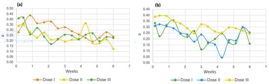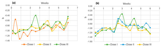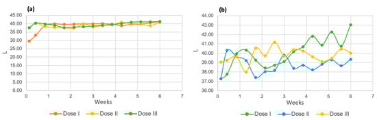 The behavior of the “a” coordinate in Chlorella spp. (Figure 15a) was similar at the three tested doses, with readings in the range of 0.20 to 0.40 units, while in the Spirulina maxima strain (Figure 15b), this coordinate had lower results, between 0.40 and 0.04. Since this axis indicates the hue between red and green, it can be interpreted that both samples have a very slight tendency toward red, which may be because the residual water among its components has blood from processed birds []. Subsequently, the values decrease until they almost reach zero, which indicates closeness to the white tone in the samples.