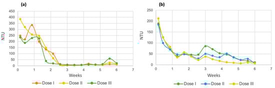 The turbidity results of the evaluation of this parameter for both varieties of microalgae are shown in Figure 17. Part a indicates the values for Chlorella spp., and it can be seen in the three doses that the removal of very evident turbidity was observed. At dose 1, the process began with a value of 248 NTU, ending with 11.82 NTU; at dose 2, it ranged from 385 NTU to 16.17; and at dose 3, the first turbidity reading was 234 NTU, which led to a total of 21.27 NTU. With the previous values, the removal percentages were 95.23% for dose 1, 95.8% for dose 2, and 90.91% for dose 3.