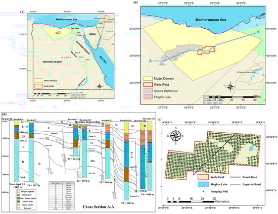 (a) Location and main features of the study area, (b) geological cross-section of the Moghra aquifer (adapted with permission from Ref. [35]. 2024, Elsevier), and (c) spatial distribution of the production wells within the development area.