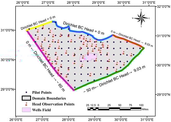 The accurate denotation of hydrogeologic conditions along the outer boundaries of the conceptual model area is essential. The BCs control fluid flows into or out of the modelled system during steady-state and time-dependent (transient state) simulations [44]. All boundaries were selected far enough from the effect of pumping wells to be regarded as constant head boundaries, as shown in Figure 2. Along the outer border of the modelled area, the first kind (Dirichlet) BC that specifies a time-constant or time-varying head value is applied. The northern and northeastern BCs were chosen to be natural boundaries (i.e., water bodies). The Mediterranean Sea completely controls the head along the northern boundary. The water level of 0.0 m was initially assigned as the head value for northern BC. A wide main canal, locally called the “El-Nubariya” canal, appears on the right side of the studied area and extends for 127 km in length. It starts as a tributary of the “El-Rayah El-Beheiry” at the “Pollin” barrage area and cuts through the sandy soil, reaching the Mediterranean Sea. Its water levels are controlled by a few hydraulic structures (e.g., regulators) and temporally change according to the releasing discharges, with an average water level of 9.03 m at its mouth [45]. Accordingly, it acts as an influent stream and is considered a source for groundwater recharge. Dirichlet BC of head linearly change from 0.0 to 9.03 m was assumed along the line striking at almost N-E direction, as shown in Figure 2. Along other borders, no natural BC or fault (water divide) exists close to the boundary. Instead, head contour lines that represent the aquifer’s water levels before initializing the development project were used [33]. The head values at each intersection of the model borders with the contour lines were assigned. Then, the interactive linear 1D interpolation tool was used to interpolate hydraulic head values along the BCs, as shown in Figure 2. Pumping wells were set as nodal BCs (i.e., the fourth kind of BC) within the development area, based on the wells map that depicts the original locations of pumping wells. Several pumping rates were assigned through a linked attribute table containing the pumping rate, radius, and screen’s top and bottom elevation of each well. The well’s diameter (outer/inner) was 420/280 mm (16.5/11″). The penetration depth reaches a maximum of 140 m into the Moghra geological formation. The screen depth was an average of 30 m.