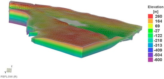 The conceptualized hydrogeological system has a simplistic physiographic feature. It is vertically composed of one main Miocene formation resting on Oligocene basaltic sheets that create thick impervious base strata, as shown in Figure 1b [50]. The topography of the model domain was retrieved using the Digital Elevation Model (DEM) processed from the Shuttle Radar Topography Mission (SRTM) data. The ground surface elevation within the model domain ranges from −111 m below MSL to 269 m above MSL, as shown in Figure 3. Two data sources were employed to locate the depth down to the impervious shale base and construct the geological stratification of the modelled area: (1) fifty-four groundwater exploration wells were excavated by the Egyptian Ministry of Water Resources and Irrigation (MWRI) to locate groundwater supplies in the Western Desert of Egypt [51], and (2) forty-two deep boreholes were drilled by the national oil companies to explore for fossil fuels in the Western Desert [52]. The subsurface lithologic elevation information of the wells was utilized in combination with surface geologic data for the expansion of the modelled grid into three dimensions (3D). Akima’s bivariate data regionalization method, along with the linear interpolation technique, was applied to assigning the elevation to a group of adjacent nodes. The aquifer’s total depth ranges from 302 to 824 m. The aquifer was then discretized into a few sublayers of varied depths with an average of 50 m. A 3D view of the constructed model domain, composed of 12 slices and 11 layers, is shown in Figure 3. A total of 143,704 elements and 84,048 nodes, which cover an area of about 5.9 × 104 km2 and a volume of 2.4 × 104 km3, were created. The flexible, unstructured discretization and local grid refinements appropriately fulfil the irregular geometry and topography of the model domain without nesting. Figure A1 in Appendix A depicts the super-element mesh that represents the basic structure of the model domain.