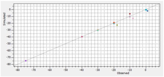 Adjusting the input properties under transient state conditions was performed by employing data from continuous pumping experiments conducted on 39 recently installed production wells [37]. The pumping analysis test is transient data commonly utilized for calibration of the groundwater flow model in cases of insufficient temporal variation in pumping records and water level [55]. The storativity was adjusted to fit the observed drawdown in response to pumping. As shown in Figure 6, the computed drawdown matches well with those observed during the pumping tests.