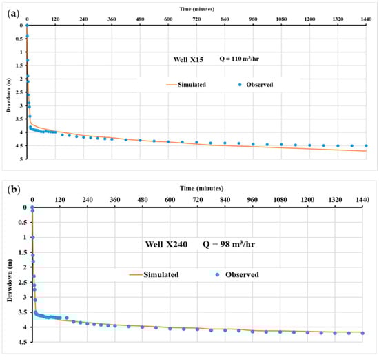 Transient calibration using (a) 24 h pumping test data of Well X15 @ (longitude 28.48° and latitude 30.12°) and (b) 48 h pumping test data of Well X136 @ (longitude 28.56° and latitude 30.27°).